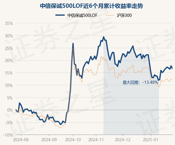 本站消息,1月27日,中信保诚500LOF最新单位净值为1.568元,累计净值为1.9867元,较前一交易日下跌0.95%。历史数据显示该基金近1个月下跌4.57%,近3个月下跌3.0%,近6个月上涨16.59%,近1年上涨13.54%。该基金近6个月的累计收益率走势如下图: