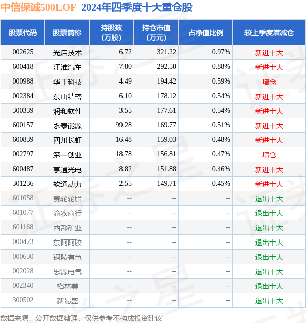 中信保诚500LOF为指数型-股票基金,根据最新一期基金季报显示,该基金资产配置:股票占净值比94.26%,债券占净值比1.52%,现金占净值比4.54%。基金十大重仓股如下: